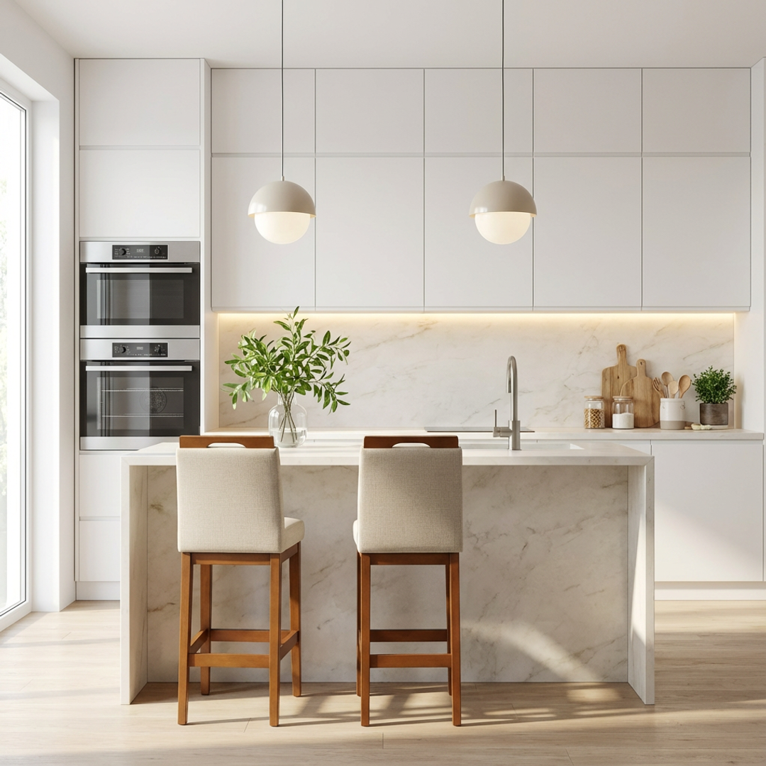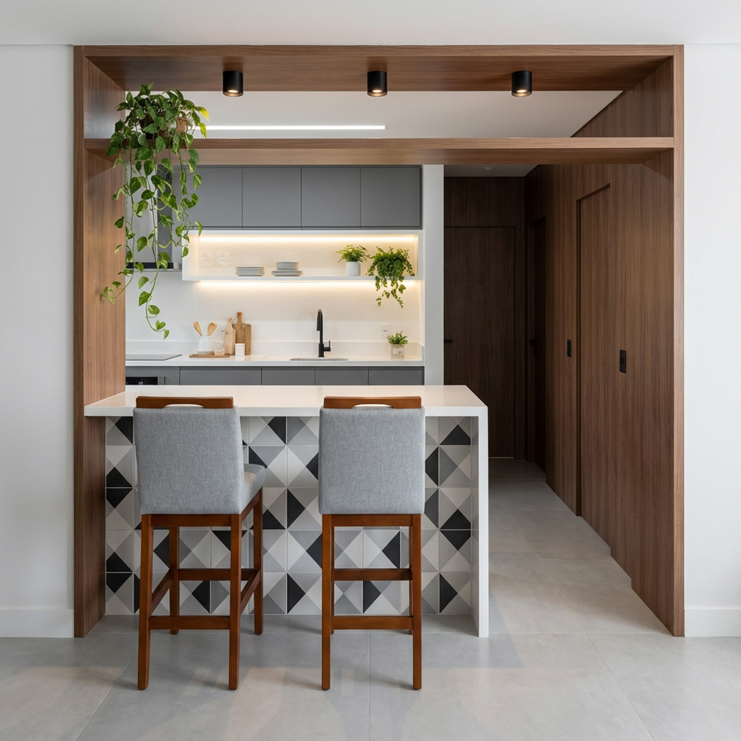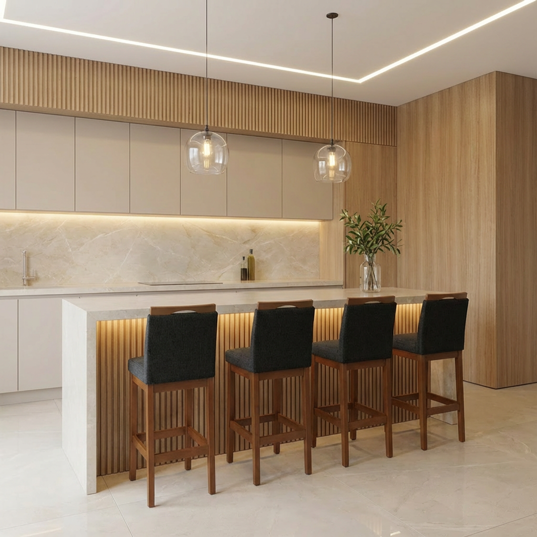 Banqueta Rubi Estofada com Encosto e Estrutura de Madeira Maciça